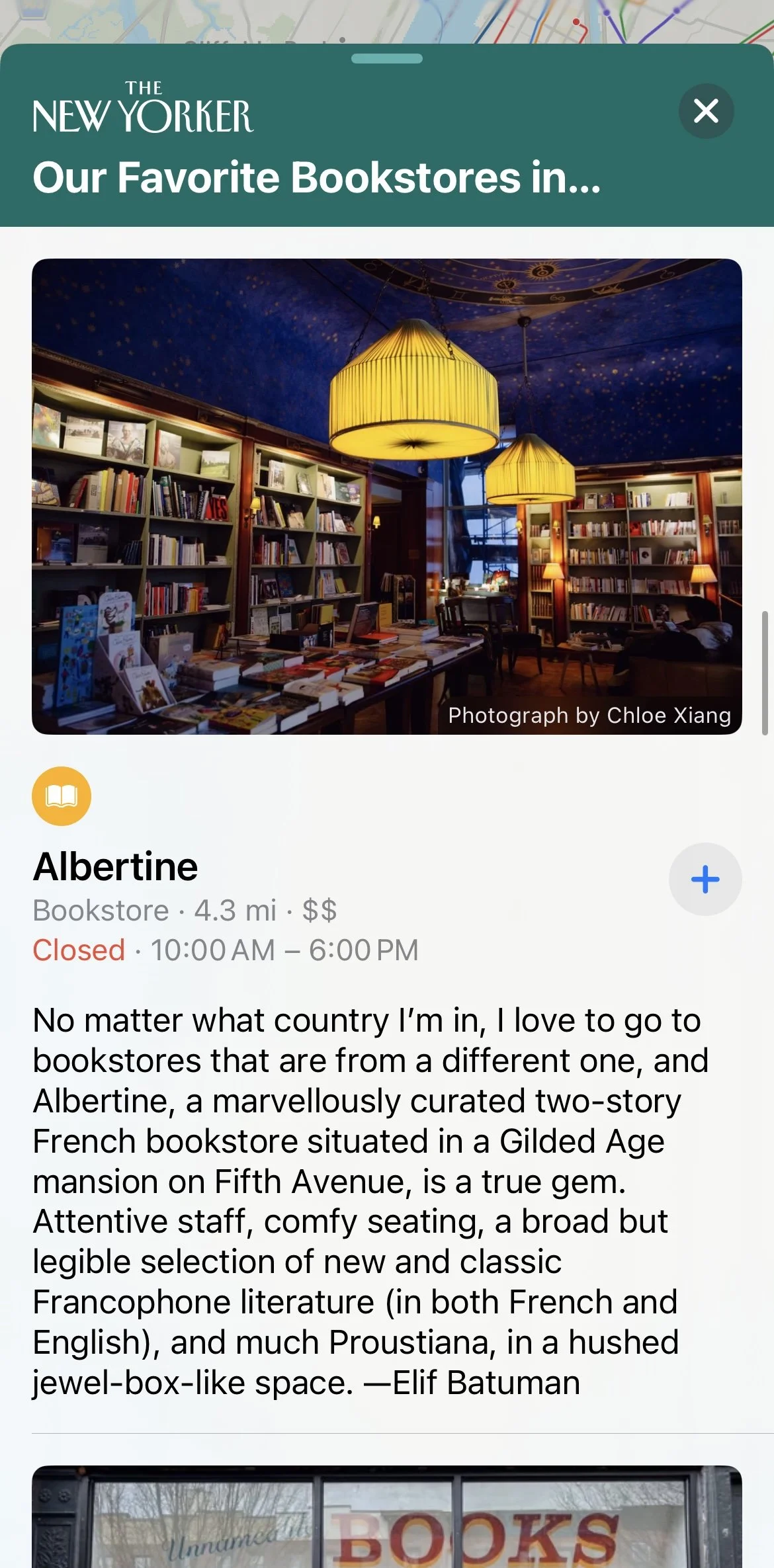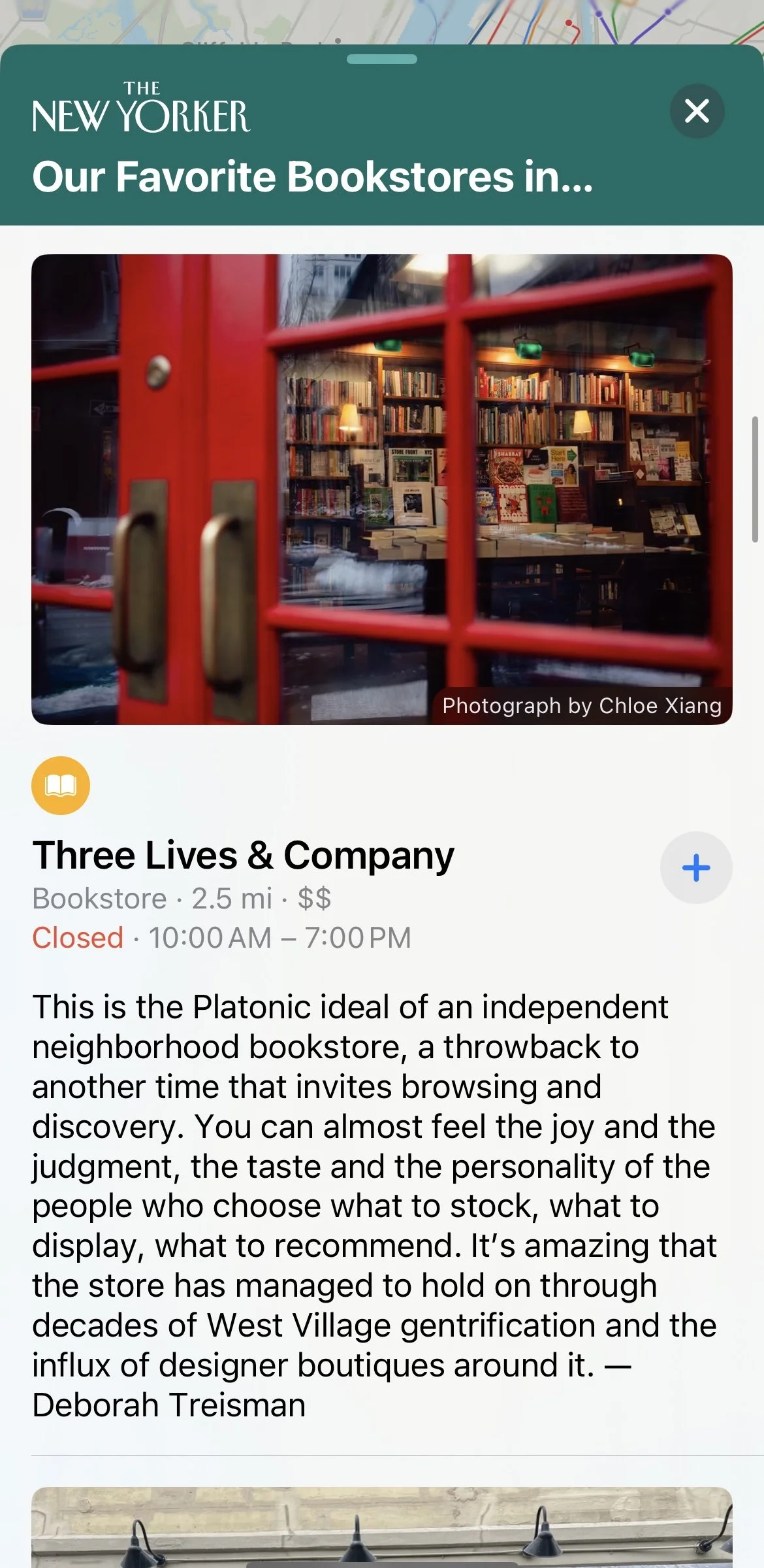 I produced a list of New Yorker writers’ favorite bookstores, featuring everyone from Hua Hsu to Elif Batuman, and launched the magazine on Apple Maps Guides with the list. I worked with the editorial and art teams to turn the list into an article, which features my writing and photography.
